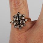 A gold ring, claw set with three circular cut sapphires within a colourless gem set surround, indistinct mark, weight 5.6g, ring size approx O.