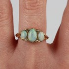 An opal and diamond ring, circa 1900, mounted with three graduated oval opals and two pairs of cushion cut diamonds at intervals, with scroll pierced sides, unmarked, weight 5.8g, ring size approx M.