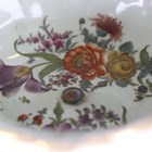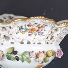 A Carl Thieme Potschappel porcelain centrepiece, late 19th century, modelled as three figures around a central floral encrusted column beneath a pierced basket, painted and applied with fruit and flowers, on a similarly decorated pierced triform base, underglaze blue factory mark, height 48.5cm (minor faults).