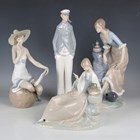 Two Lladro figures, comprising Sea Captain, No. 4621 and Pensive Clown, No. 5130, together with four Nao figures, including a lady seated beside a bird (some restoration).