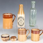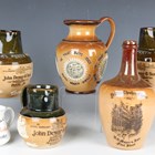 A collection of mostly stoneware 20th century advertising wares, including a Doulton Lambeth trio of Dewar & Sons Limited Distillers jugs, height of tallest 16.3cm, and a Doulton Lambeth 'Ye Olde Cheshire Cheese 1607' whisky dispenser (some faults).