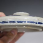 A Dutch Delft two-handled posset pot and cover, 18th century, the circular body painted in blue with a wavy foliate band, height 12cm (restoration to rim of cover), together with a late 17th/early 18th century spouted example with floral panels (extensively restored).