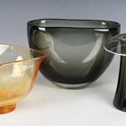 A Whitefriars shadow green white enamel edged glass vase, circa 1964, designed by Geoffrey Baxter, with everted rim, shape No. 9639, height 18cm, together with a small group of mostly Whitefriars glassware, including a willow cased bowl of hemispherical shape (minor faults).