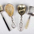 An early Victorian silver caddy spoon of basketweave form with gilt bowl and cast entwined ropetwist handle, London 1859 by Charles Thomas Fox & George Fox, length 10cm, a silver caddy spoon with pierced scroll handle, London 1882 by Holland, Son & Slater, length 11.5cm, and two silver caddy shovels, one with mother-of-pearl handle, Birmingham 1809 by William Pugh, length 9.2cm, the other with turned ebonized handle, Birmingham 1819 by Joseph Taylor, length 11.5cm, total weight 69.8g.