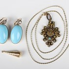 A pair of gold, diamond and pale blue paste imitating turquoise drop shaped earrings, each surmounted with a cushion cut diamond, unmarked, weight 11.5g, length 3.5cm, one 9ct gold earring drop, weight 1.4g, and a Middle Eastern gilt metal pendant, fitted to a gold neckchain, detailed indistinct mark, with a boltring clasp, weight of chain 2.4g.