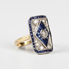 A gold, sapphire and diamond ring in an Art Deco inspired design, collet set with the principal circular cut diamond within a lozenge shaped surround, mounted with calibre cut sapphires, otherwise set with smaller circular cut diamonds with an outer border of calibre cut sapphires, detailed '18K', weight 4.1g, ring size approx I, with an associated case.