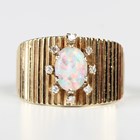A gold ring, claw set with an oval opal within a surround of eight circular cut diamonds, otherwise with ridged decoration, detailed '14K', weight 4.7g, ring size approx O1/2.