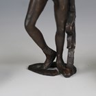 A late 19th century brass tobacco box of curved oval form, engraved 'H.M.S. Undefatigable' with name 'G. Roope', length 10cm, a nickel plated copper tobacco box of similar shape, foliate engraved and named 'A.J. Wilson', length 10.3cm, and a cast bronze figure of a young ballerina, indistinctly signed, height 14cm.