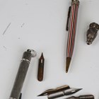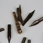A collection of novelty propelling pencils, mainly early 20th century, comprising a top hat and umbrella, length 11cm, a gilt metal cannon barrel, a hammer, a champagne bottle, a long horn and four others, together with a white metal pencil holder, formed as an owl with orange glass eyes, length 3cm.