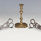 A pair of 18th century cut steel candle snuffers, stamped with crown over 'Patent CP.IL', length 17.5cm, another similar pair of steel candle snuffers, length 17.5cm, and an 18th century style brass taperstick, height 11.5cm.