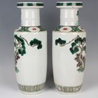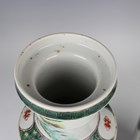 A pair of Chinese famille verte porcelain rouleau vases, late Qing dynasty, each painted with two maidens in a fenced garden below a landscape to necks and keyfret band to rim, unmarked, height 30.5cm.