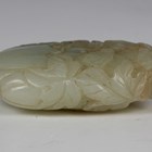 A Chinese pale celadon jade pendant, probably 20th century, carved as two pumpkins enveloped in their own vine and leaves, length 5.2cm.