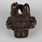 A Japanese carved wood netsuke, Meiji period, finely carved as three oni opening a sack, incised signature to underside, height 3.1cm, together with another carved wood netsuke, modelled as a seated oni, unsigned, height 4cm.