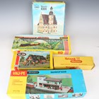 A collection of gauge OO/HO lineside accessories, including a Heljan B208 shop, a Kibri Bausatz 8300 town building, a Faller B-548 bridge, Merit accessories and rolls of grass landscape.