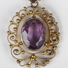 A silver gilt and amethyst brooch in a cannetille work design with three pendant drops, unmarked, weight 14.6g, width 5.8cm, length 8.2cm.