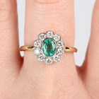 A gold, emerald and diamond oval cluster ring, collet set with the oval cut emerald within a surround of circular cut diamonds, unmarked, weight 2.8g, ring size approx N1/2.