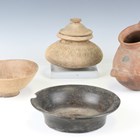 A group of mainly ancient pottery vessels, including a Chinese Neolithic pottery twin-handled vase with painted surface decoration, height 20cm, a bird-lipped jug and a later pre-Columbian style figural vessel.