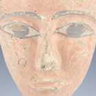An Egyptian carved wooden funerary mask, possibly Late period, 664-332 BC, the face with painted gesso surface of pale pink and white, detailed in pale grey, height 23cm, mounted on a modern stand.