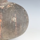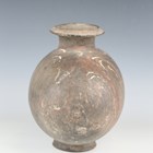 A Chinese Han dynasty pottery cocoon jar of wide bulbous form, the surface covered with swirls of pigment, height 26cm, width 29cm (faults and repairs).