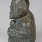 A pre-Columbian Olmec style carved green hardstone figure of a seated elderly man, possibly 900-450 BC, bearing collector's labels, detailed with possible find site as Veracruz, height 10cm, width 6.5cm. Provenance: from the estate of a West Sussex collector.