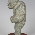 A pre-Columbian Olmec style carved green hardstone starcatcher figure, possibly 900-450 BC, holding a bowl and modelled with deformed skull, height 12cm. Provenance: from the estate of a West Sussex collector.