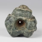 A pre-Columbian Olmec style carved green hardstone bead, possibly 900-450 BC, finely modelled with three faces representing youth, old age and death, height 3.4cm, width 4.2cm, together with a pre-Columbian Olmec style green hardstone twelve bead necklace, length 26cm, a lava rock ring, possibly Aztec civilization, diameter 6cm, and a similar fifteen-bead bracelet. Provenance: from the estate of a West Sussex collector.