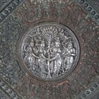 A pair of 19th century Indian copper and silver mounted chargers, each of octagonal form, the circular centre embossed with figures flanking a tree of life within an ornately embossed wide border, width 41cm, and a pair of 20th century Indian brass circular chargers, each with ornate foliate engraved decoration, diameter 35cm.