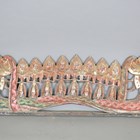 A mid-20th century Indian polychrome painted wooden panel, carved in deep relief with Ganesh and figural attendants within a rectangular foliate carved wide border, height 180cm, width 33cm, and a smaller carved wooden panel, probably South-east Asian, length 97cm.