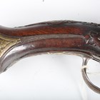 A pair of mid-18th century 18-bore flintlock horse pistols by Patateen Lamours with shaped circular ribbed barrels, barrel length 32.5cm, carved walnut full stocks with foliate and damascened yellow metal and steel decoration, the top of the grips detailed with stylized busts, and push-in wooden ramrods.