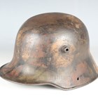 A First World War period German M16 camouflaged steel combat helmet, height 17cm (some deterioration to interior, lacking lining).
