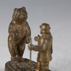 An early 20th century Austrian cast bronze figure of a boy selling roasted chestnuts, bearing Bergman amphora mark and detailed 'Austria', height 7cm, together with a cast bronze model of a bear and trainer, width 5.5cm, and an Austrian cold painted bronze figure of an Arabian man kneeling on a carpet.