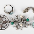 A diamond and blue zircon ring, claw set with the circular cut blue zircon between diamond set three stone shoulders, ring size approx Q, and a small group of other jewellery, including an aquamarine pendant drop, a silver, cultured pearl and green gem set brooch of abstract design, detailed '835', weight 11.2g, a Scottish silver brooch, Edinburgh 1977, weight 7.3g, and a heart shaped pendant locket, the front applied with a shamrock motif.