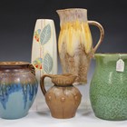 A large mixed group of mostly British art and decorative pottery, late 19th and 20th century, including a pair of Chameleon Ware vases, height 27.3cm, a Royal Cauldon two-handled tubelined vase, a Danesby Ware two-handled vase, a Wardle planter, an Eichwald plate (restored), Brannam and Beswick.
