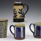 A Doulton Lambeth stoneware beaker, circa 1878, decorated by Harriet E. Hibbutt, monogrammed, with relief bosses between stylized leaves, height 12.2cm (minor chip to rim), together with a silver mounted Doulton Lambeth jug and a pair of Royal Doulton mugs.