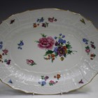 A part set of Meissen tablewares, 19th century, painted with Deutsche Blumen beneath a spiral moulded rim with trellis panels, comprising six plates, diameter 24cm, an oval dish, length 32cm, and a square dish, length 20.5cm, crossed swords marks in underglaze blue with incised and impressed numerals (minor faults).