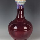 A Chinese flambé glazed bottle vase, Qing dynasty, possibly 18th century, the globular body with moulded central girdle below a similarly moulded flared cylindrical neck, covered in a purple streaky glaze, height 35.4cm.