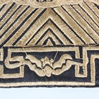A pair of Chinese military style silk embroidered rank badges, early 20th century, each worked in coloured threads with a Buddhistic lion standing on a rock, surrounded by a peach branch, bats, vapours and auspicious objects, all above crashing waves on a black ground, 28cm x 30cm, together with another rank badge, decorated in gilt thread with a qilin standing on a rock amidst flowers and vapours on a black ground, 26cm x 25.5cm.