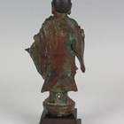A Chinese bronze figure of Buddha, probably 8-9th century, with some verdigris patination, modelled standing wearing a flowing robe, on a circular base, height 12.5cm, mounted on a metal plinth base.