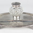 A late Victorian silver oval inkstand, fitted with a cut glass inkwell with silver hinged lid and collar above a pen recess within a gadrooned rim, raised on reeded feet, London 1896 by Josiah Williams & Co, weight of stand only 270g, length 19.7cm (hinge faulty).
