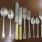 An Art Deco A.E. Poston & Co Ltd Lonsdale part canteen of plated cutlery, the knives with ivory effect handles, comprising twelve table knives and forks, six tablespoons, twelve dessert knives, forks and spoons, twelve soup spoons, twelve fish knives and forks, pair of fish servers, gravy spoon, soup ladle, two sauce ladles, twelve teaspoons, five egg spoons, and two carving knives and forks, within an oak two-drawer canteen table.