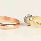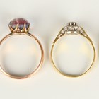 An 18ct gold and diamond five stone cluster ring, Birmingham 1975, weight 2.5g, ring size approx P, a 9ct gold, aquamarine and diamond three stone ring, a 9ct gold, diamond and green gem set half-hoop ring, total weight 3.4g, and a gold and gem set solitaire ring, unmarked, weight 3g.