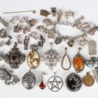 A group of mostly silver and silver mounted jewellery, comprising a charm bracelet with a heart shaped padlock clasp, Birmingham 1976, a circular marcasite brooch, ten pendants, fifteen charms and six further items.