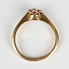A gold, ruby and diamond seven stone cluster ring, mounted with a cushion cut ruby within a surround of six diamonds, detailed '18', weight 2.4g, ring size approx L.