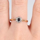 A gold and platinum, sapphire and diamond seven stone cluster ring, mounted with a cushion cut sapphire within a surround of six diamonds, detailed '18ct Plat', weight 1.8g, ring size approx P.