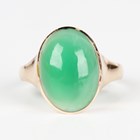 A gold ring, collet set with an oval dyed green chalcedony, detailed '9ct', weight 3.5g, ring size approx Q1/2, and a gold mounted oval dyed green chalcedony pendant, the suspension loop detailed '14K 585', weight 3.1g, length 2.7cm.