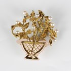 A gold, rose quartz and cultured pearl brooch, designed as a plant in a pot with naturalistic formed leaves, mounted with cultured pearls at intervals, the rose quartz pot with carved decoration, unmarked, weight 16.5g, width 4.3cm, with an associated case.