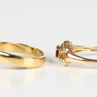 A 9ct gold, ruby and diamond cluster ring, ring size approx P (one ruby lacking), a 9ct gold, sapphire and colourless gem set ring, total weight 4g, a gold ring, claw set with an oval cut ruby, detailed '585 14K', weight 1.6g, and another ring.