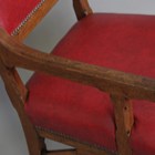 A late Victorian Gothic Revival oak framed elbow chair, in the manner of Charles Bevan, the top rail carved with thistles and leaves above a chamfered frame, height 89cm, width 58cm.