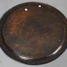 An Arts and Crafts hammered copper tray by Hugh Wallis, the raised border with overlaid pewter chevrons, bearing maker's stamp, raised on an oak folding stand, height 53cm, diameter 58cm.