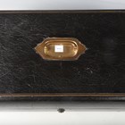 An early 20th century black leather and gilt-tooled writing box with brass handle and fitted interior, height 10.5cm, width 34cm, depth 23.5cm.